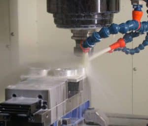 Cutting fluid being applied to a CNC milling process (Source: Wikipedia.com)