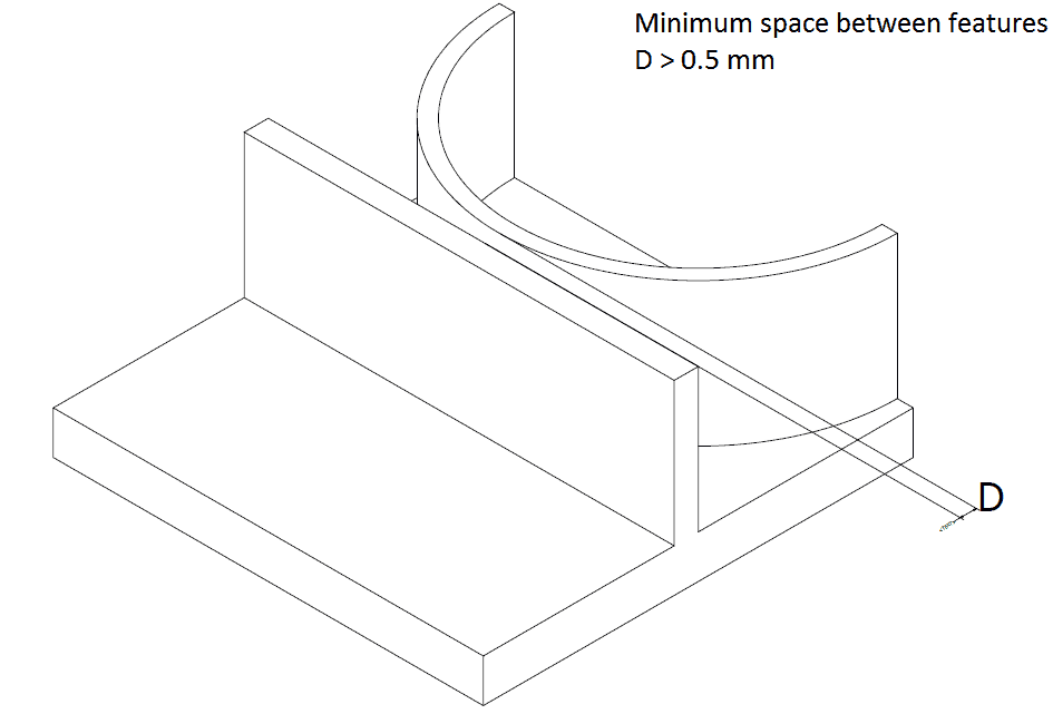 Because of the heat-dissipating from the laser into the surrounding powder during DMLS, the laser creates a melt pool that is slightly larger than its diameter. As a result of this, features that are too close to each other may fuse together. Another possible implication is the creation of a section of unsintered powder stuck between sintered areas. To avoid these, leave a space of at least 0.5 mm between features.