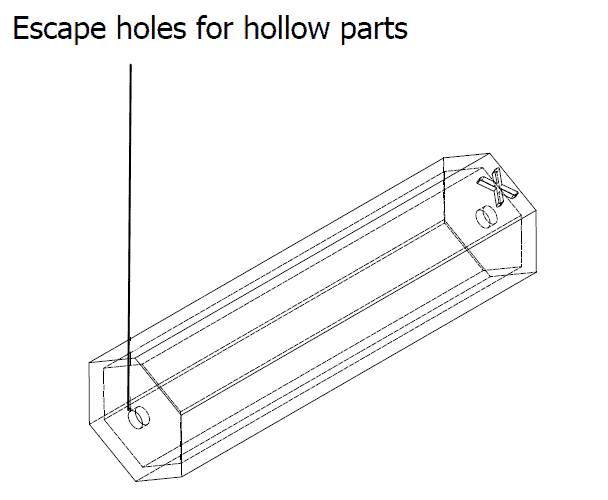 To reduce material usage and the weight of the finished product, parts can be designed hollow. In most cases, this does not affect a part’s final application. For hollow parts, include escape holes in your design to enable you to remove residual unsintered powder from the hollow section.