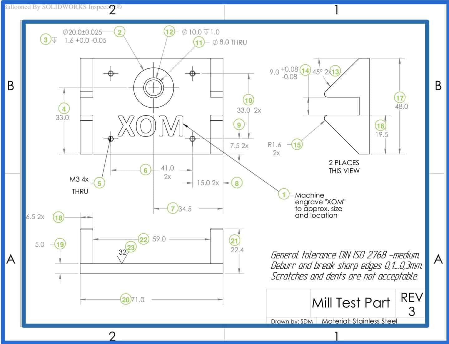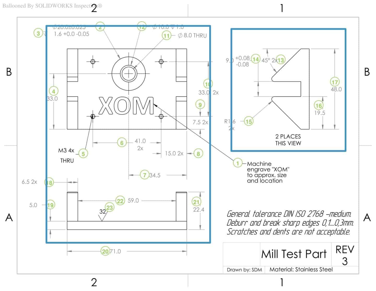 The isometric view is a 3D pictorial representation of the part. While it’s not always necessary, it is a good practice to include the isometric view in a technical drawing as it makes it easier for the machinist to understand the part geometry. In addition to providing more details about a part, the isometric view may also provide information such as installation direction and build orientation.